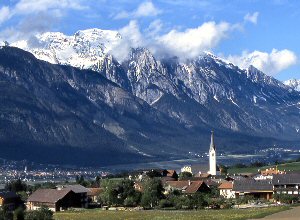 Aldrans auf der Mittelgebirgsterrasse über Innsbruck. Im Hintergrund der Bettelwurf