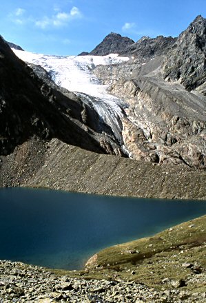 Während sich die Gletscherzunge durch die letzten warmen Jahrzehnte weit zurückgezogen hat, zeigt die Moräne, hinter der sich ein See gebildet hat, wie weit der Gletscher beim letzten Vorstoß gekommen ist.