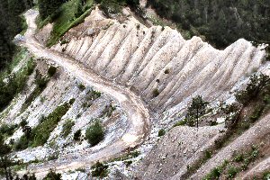 Angeschnittene Moräne am Weg zur Hölltalklamm bei Boden im Bschlaber Tal. Der Druck des Gletschers hat den Moränenschotter recht gut verfestigt, sodass die Moräne auch ohne Vegetationsdecke der Erosion eine zeitlang widerstehen kann.