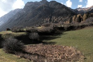 Die Moräne eines Gletschervorstoßes am Ende der Eiszeit bei Trins im Gschnitztal mit einem verlandenden Toteisloch davor