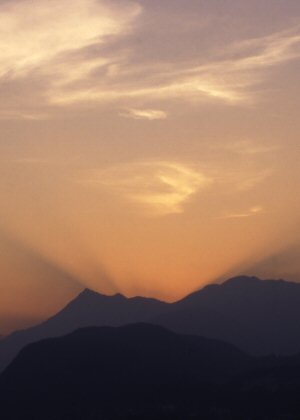 Sonnenuntergang hinter dem Tschirgant, östlich von Imst, von Mösern aus gesehen