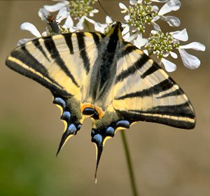 Der wämeliebende Segelfalter, häufig am Mittelmeer, bewohnt in Tirol Wärmeinseln wie die Fließer Steppenhänge oder den Hang der Nordkette über Innsbruck.