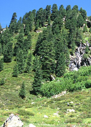 In den Zentralalpen werden die Fichten im oberen Waldbereich abgelöst von Lärchen und den besonders kälteresistenten Zirben, die dann die natürliche Waldgrenze bilden. Das schöne und gut duftende Zirbenholz wurde gerne vom Menschen genutzt, daher sind größere Zirbenwälder selten geworden. Reiche Bestände finden sich am Patscherkofel bei Innsbruck, im Radurschltal im Oberinntal und im Nationalpark Hohe Tauern.