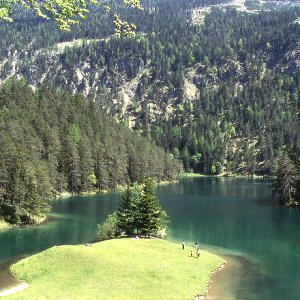 Der Fernsteinsee ist ein Ergebnis des gewaltigen Bergsturzes. Links der bewaldete Tomahügel