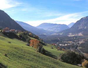 Blick von Haimingberg auf das bewaldete Bergsturzgelände "Forchet" hinter Ötztal-Bahnhof