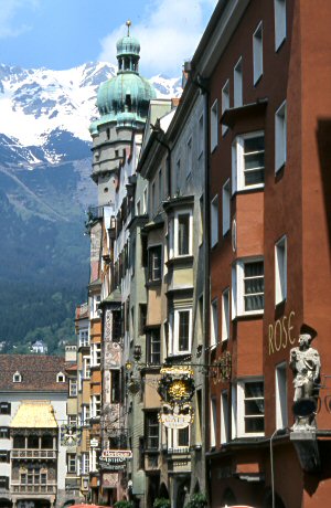 Die Innsbrucker Altstadt mit Stadtturm und Goldenem Dachl ist ein schönes Beispiel mittelalterlichen Städtebaus am Übergang der Gotik zur Renaissance.