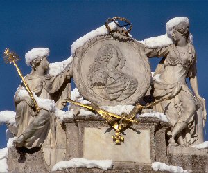 Kaiserin Maria-Theresia und Kaiser Franz-Stephan krönen die Triumphpforte in Innsbruck, die 1765 zur Hochzeit von deren zweitältestem Sohn Leopold gebaut wurde.