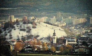 Innsbruck: Blick auf das dörfliche Arzl und das moderne Olympische Dorf dahinter