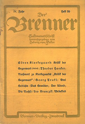 Um für den Südtiroler Querdenker Carl Dallago (1869-1949) ein Publikationsmedium zu schaffen, gründete Ludwig von Ficker (1880-1967) 1910 in Innsbruck die Zeitschrift "Der Brenner". Da das Blatt eine literarisch-philosophische Auseinandersetzung eröffnete, die die ideologisch immer engstirniger werdenden "Jungtiroler" hinter sich ließ, wurde die Zeitschrift bald weit über die Grenzen hinaus bedeutend. Neben einheimischen Dichtern wie Anton Santer (1884-1979), Josef Leitgeb (1897-1952) und Friedrich Punt (1898-1969) veröffentlichten im Brenner auch Schriftsteller wie Hermann Broch, Else Lasker-Schüler und Theodor Haecker. Ficker entdeckte Georg Trakl und förderte den Salzburger Dichter bis zu dessen Tod im Jahr 1914. Nicht nur sprengte "Der Brenner" die Grenzen der Provinz in jeder Hinsicht, er dokumentiert auch jenen Aufbruch in die Moderne, der die europäische Kulturgeschichte im beginnenden 20. Jh. bestimmte. 1940 wurde er als "schädliches und unerwünschtes Schrifttum" verboten.