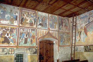 Die Wände der kleinen Georgskirche zwischen Serfaus und Tösens sind innen vollständig bemalt. Der zufriedene Künstler hat sich verewigt: "anno dem 1482 das gemal hat gemacht max maller von inspruck in grosser arbeit".