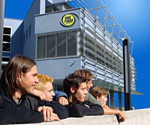 Schüler vor dem Gebäude der Handelsakademie und Handelsschule Landeck