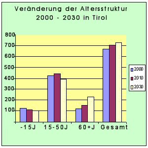 Zu Beginn des 21. Jahrhunderts könnte man das Problem der Bevölkerungsentwicklung (und dies gilt nicht nur für Tirol) unter der Formel "Weniger Geburten, höhere Lebenserwartung" zusammenfassen. Dies wird weitreichende Folgen für die Zukunft haben. So werden um 2030 in Tirol auf etwa vier Erwerbspersonen schon sechs Nicht-Erwerbspersonen (mehrheitlich Senioren) entfallen und bis 2050 verschärft sich diese Relation nach dem derzeitigen Stand der Dinge auf 38 zu 62 (!).