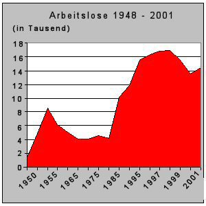 Gemessen an der absoluten Zahl der Arbeitslosen erscheinen dagegen - verglichen mit dem letzten Jahrzehnt des 20. Jahrhunderts - die Krisenjahre Anfang der 1950er Jahre recht "harmlos". Mit fast 17.000 (16.904) waren im Jahr 1998 rund doppelt so viele arbeitslos als 1953.