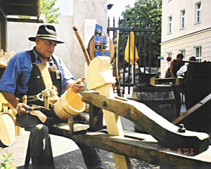 Ein Mitarbeiter der Firma Diogenes, einer der letzten aktiven Fassbinder-Betriebe Tirols in Debant bei Lienz, führt sein Handwerk bei einer Veranstaltung in Lienz vor.